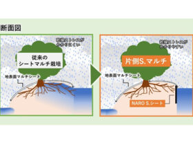 農研機構、福岡県農林業総合試験場、熊本県農業研究センターはこのほど、排水設計された平坦地の園地向けに開発されたシールディング・マルチ栽培(NARO S.マルチ)技術を改良し、階段畑に適用可能にした「片側S.マルチ」を開…