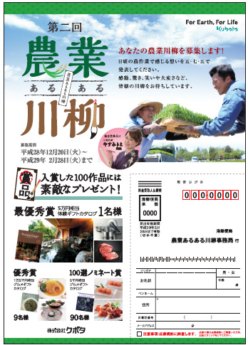 (株)クボタは、農業への想いを詠んだ川柳を全国から募集する「第2回農業あるある川柳」を2月28日まで募集している。今回のテーマは「農村の春」。プロ川柳作家・やすみりえ氏の審査による100選を5月上旬に…