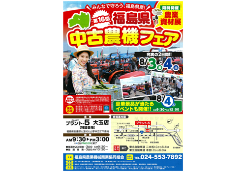 第16回福島県中古農機フェア(主催:福島県農業機械商業協同組合)が8月3・4日に大玉村のプラント5で開催される。県内での中古農機の有効活用による農業生産コストの低減などを目的とし、目標額は中古農機で8…