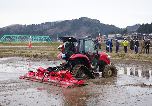 (株)ササキコーポレーションは、中型トラクタ向け4.1m幅で電動開閉式の超耕速マックスハローACEMAX414DXAの7月発売に向けて2020年マックスハローエースお披露目体感会を栃木県と秋田県で開催。製品評価は仕上がり・スピード共に高い。今回3カ所目のお披露目体感会を新潟県長岡市で開催。今回は(有)グリーンの呼びかけで小雨の空模様ながら近隣の個人農家20人が参集するなど小規模な体感会を行った。