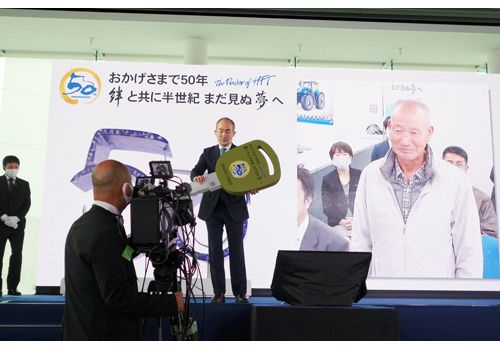 日本ニューホランド(株)は6日、全国25営業所をWEB会議システムで繋ぎ、創立50周年記念式典を苫小牧デポ内ビジターセンターで開催した。日本向け50台限定で特注された特別記念トラクタも紹介。色調はプロフォンドブルーでオートコマンド標準装備。エンブレムや特別刺繍を施したフロアマットなど全体的に上質かつスタイリッシュに仕上げた。