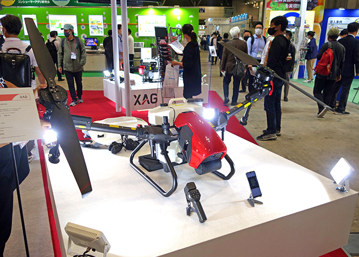XAG JAPAN(株)は、農業Weekに出展し、量産型農業用無人車R150とそのアタッチメントとして粒剤システムや草刈システム、荷台を設置した機体を参考出品。また来年発売の新型農業用ドローンとして薬剤タンク容量16LのP40と20LのV40を発表した。V40は2ローターでダウンウォッシュが強く強力な散布を行うのに最適。また20日発表のグッドデザイン賞も受賞するなど他にない製品である。