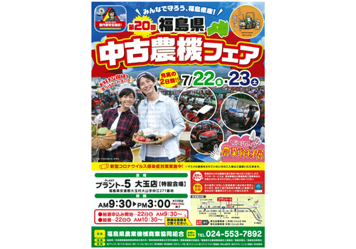 福島県農業機械商業協同組合(渡部芳崇理事長)は7月22、23の両日、第20回福島県中古農機フェアを開催、同時に農業資材展も行う。会場は、プラント―5大玉店特設会場(福島県大玉村大山字中江271)で、アクセスは、車で東北自動車道二本松ICから6・4km、または本宮ICから6・8km。開催時間は午前9時30分~午後3時(23日は午後2時まで)。機種別の抽選申し込みは初日22日の午前9時30分~、抽選は同10時30分~。