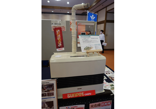 (株)長府製作所花巻工場(旧SUNPOT)は、岩手県内限定で光合成促進機「KCA―1000」を発売している。岩手県農業研究センターと共同開発したもので、小型コンパクトながら60~100坪のハウスを灯油式(AC100V電源使用)で炭酸ガスを送付機(別途購入)からビニールダクトを通して作物の株間に設置した穴あきダクトを経由して局所施用。功利的で無駄なく光合成を促進する。先般県主催のスマート農業シンポジウムではコマ展示と企業プレゼンを行った。
