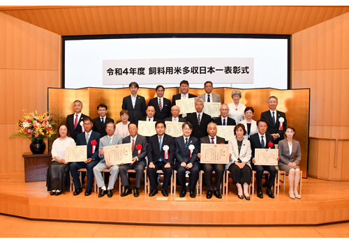 農林水産省と(一社)日本飼料用米振興協会(海老澤惠子理事長)は7月21日、東京大学弥生講堂・一条ホールで「令和4年度飼料用米多収日本一表彰式」と「飼料用米普及シンポジウム」を開催した。飼料用米多収日本一表彰は、生産技術の面から先進的で他の模範となる飼料用米生産者を表彰し、その成果を広く紹介することで、飼料用米生産農家の生産技術水準向上を図ることを目的として実施している。受賞者が一同に会しての表彰式は、新型コロナ感染症の影響で4年ぶり。
