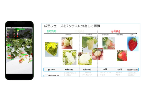 (株)ナイルワークスは、スマホで撮影した動画をアップロードするだけで、クラウド上でイチゴの熟度を判定し熟度ごとの果実数をカウント、その後の積算温度をもとに生育予測情報を手軽に得られるイチゴ収量予測ツールを開発、提供開始した。同社のフェノタイピング技術を活用し、作物の外観や形状、成長パターン等を観察・測定し、イチゴの熟度を瞬時に分析。緑熟期、白熟期、赤熟期など熟度ごとに果実数をカウントするもの。