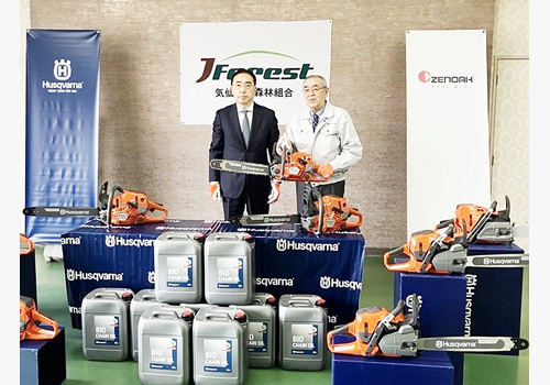 ハスクバーナ・ゼノア(株)は、2月に岩手県大船渡市で発生した林野火災の一日も早い復興支援のため、甚大な被害を受けた気仙地方森林組合に対しプロフェッショナル向けのチェンソー9台および生分解性のチェンオイル20本(20L)を寄贈した。気仙地方森林組合では、火災により森林管理に不可欠な重機やチェンソーなどが焼ける被害を受けた。そうした中で今回、倒木や焼損木の除去、通行路の確保、再植林準備など山林火災後の復興に欠かせないチェンソーを支援することで平成以降で最大の山林火災の復興の一助になるべく寄贈することにしたもの。4月18日には贈呈式が気仙地方森林組合で行われた。