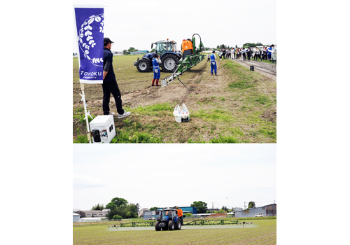 東北大学大学院農学研究科が代表機関(事務局)を務める「みやぎRTK利用拡大コンソーシアム」は5月23日、令和7年度みやぎRTK現地研修会として、宮城県石巻市にある(有)高須賀農産の乾田直播のほ場で、ISOBUS対応のブームスプレーヤによる除草剤散布の実演を行った。同日は生産者、メーカー、行政、金融機関、研究機関などから35人が参加した。