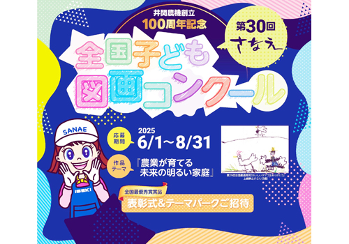 井関グループでは、子どもたちの食農教育の一環として毎年、さなえ全国図画コンクールを開催している。今年30回目を迎える中で、昨年は全国から約1600点の子どもたちの秀作が集まるなどすっかり定着したイベントとなっている。また今年は井関農機創立100周年に当たる記念開催となる。そうした中で今年、作品テーマを『農業が育てる未来の明るい家庭』とした。