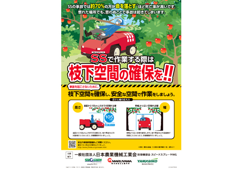 (一社)日本農業機械工業会防除機部会スピードスプレーヤ(SS)WGはこのほど、SS作業における挟まれ事故を防止するために、果樹園内の作業道における枝下空間の確保を呼びかける安全啓発チラシを作成し、同工業会ホームページ上で公開した(http://www.jfmma.or.jp/anzen.html)。SSの事故の約7割が死亡事故となる中、事故を未然に防ぐためにも、樹園の枝下空間を十分に確保し、安全な環境を整えて作業することが重要となる。今回の安全啓発チラシは、同工業会の会員企業である(株)ショーシン、(株)丸山製作所、(株)やまびこの3者からなるSSWGが作成したもので、同WGが令和3年度に作成した安全作業のポイントをまとめた動画・チラシに続くもの。