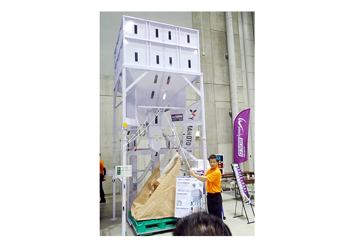 (株)山本製作所は8月28日、「第100回山形農業まつり農機ショー」会場において、「大型遠赤循環型乾燥機」2型式と「汎用フレコン計量ユニット」の新製品発表会を開催、今回紙面では「汎用フレコン計量ユニットYFC-1400W」の詳細をお知らせした。同機は、大豆生産における省力化ニーズの高まりによりフレコン出荷が増加する中、米・麦との汎用性プラス使いやすさを追求した製品となっている。業界初の汎用フレコン計量機で、米・麦以外に大豆も計量可能。大豆の「大粒・中粒」や、米の「整粒・屑米」など、2種類の穀物を駐留できるダブルタンク構造で、製品一体型の昇降機も2本搭載し各タンクに振り分けて搬送できる。