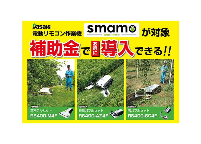 (株)ササキコーポレーションの電動リモコン作業機「スマモ」が、環境省による令和7年度二酸化炭素排出抑制対策事業費等補助金(運輸部門の脱炭素化に向けた先進的システム社会実装促進事業のうち、農業機械の電動化促進事業)の対象機種に選定された。この補助金は、農業分野での温室効果ガス排出量削減(脱炭素化)を加速するために電動農機の導入を支援するもので、選定機種について必須のオプション等を含む電動農機の販売価格と対応する従来型でエンジン搭載の農業機械の販売価格を基礎として算定した差額の3分の2を基準額に補助される。対象機種は、草刈フルセットのRS400-M4F、畦草刈フルセットのRS400-AZ4F、際刈フルセットのRS400-SC4Fの3型式。各機種の補助額の詳細は同社まで。