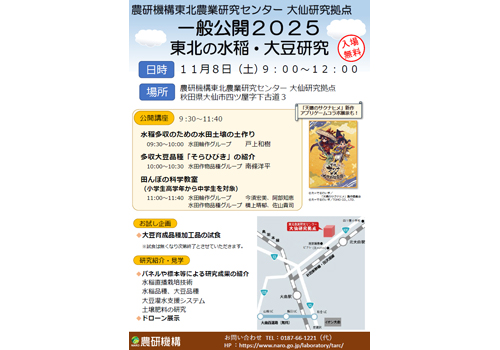 農研機構東北農業研究センター・大仙研究拠点(秋田県大仙市四ツ屋字下古道3)は、恒例行事として好評の「一般公開」を、11月8日午前9時~正午に行う。「東北の水稲・大豆研究」をテーマに取り組みの紹介を行う。9時半~11時40分の公開講座では、9時半から水稲輪作グループによる「水稲多収のための水田土壌の土づくり」、10時から水田作物品種グループによる「多収大豆品種『そらひびき』の紹介」、11時から小学生高学年~中学生を対象にした「田んぼの科学教室」が開かれる。