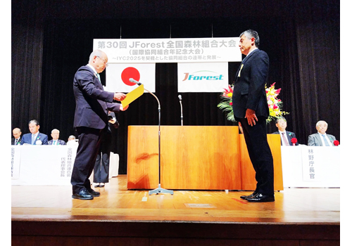 やまびこグループは10月21日、銀座ブロッサム中央会館で開催された第30回全国森林組合大会において資材提供を通じた被災地復興への貢献が評価され、全国森林組合連合会の中崎和久代表理事会長より表彰状が水嶋伸介執行役員(やまびこジャパン(株)社長)に授与された。
