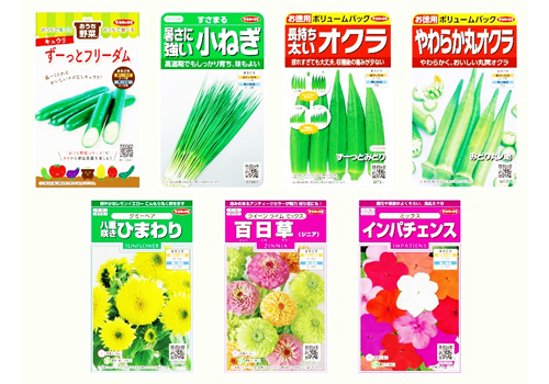 (株)サカタのタネは、草花・野菜・ハーブ類の統一絵袋ブランド「実咲(みさき)」シリーズに2026年春の新商品として7点を追加し、12月から順次発売する。野菜では①キュウリ「おうち野菜 キュウリ ずーっとフリーダム」②小ネギ「暑さに強い小ねぎ すさまる」③オクラ「お徳用ボリュームパック 長持ち太いオクラ ずーっとみどり」④オクラ「お徳用ボリュームパック やわらか丸オクラ みどり丸ノ助」の4点、花では⑤ヒマワリ「八重咲きひまわり グミーベア」⑥ジニア「百日草 クイーン ライム ミックス」⑦インパチェンス「インパチェンス ミックス」の3点。
