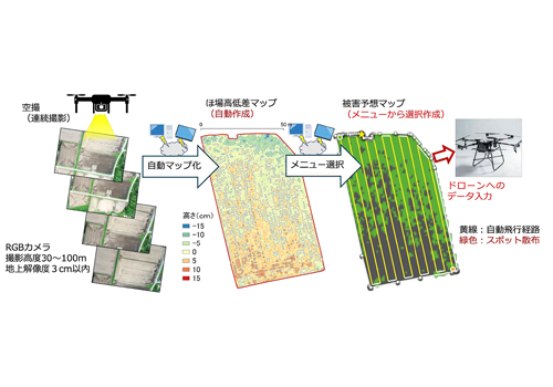 農研機構は、スクミリンゴガイによる水稲被害の発生予測マップを自動作成し、そのマップに基づいて薬剤をスポット散布できるドローン防除システムを開発した。これにより、薬剤の使用量、薬剤補給の回数、作業時間を削減し、コスト削減につなげられる。今回、同機構ではスクミリンゴガイによる被害予測アルゴリズムとこれに基づきドローン空撮画像から被害エリアを図示できる「自動マップ化アプリ」、作成された予測マップをもとに被害エリアのみに薬剤を散布できるドローン防除システムを開発した。