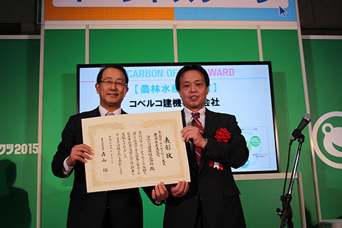 コベルコ建機(株)は、12月11日、東京ビッグサイトで開催された「第17回エコプロダクツ2015」で「第5回カーボン・オフセット大賞」の農林水産大臣賞を受賞した。表彰式後は環境省ブースにて、「コベルコ…