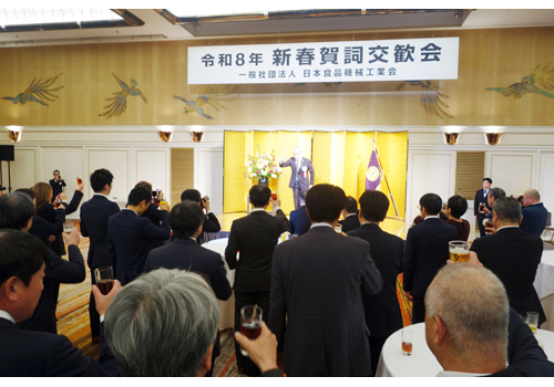 (一社)日本食品機械工業会(大川原行雄会長)は、2026年新春賀詞交歓会を東京プリンスホテル(東京都港区)で開催した。当日は会員企業など384人が参集した。冒頭、大川原会長が挨拶。「業界を取り巻く環境で数多くの課題を抱える中で、特に少子高齢化が進む中で国際競争力を高めることが喫緊の課題だ。現在、食品安全衛生や人材育成、SDGs、タイ・インドでのFOOMAパビリオン出展など海外展開に力を入れる中、今年は関係団体と共にUAE海外展示会での出展も計画する。そうした中で会員数は毎年増加し、正会員251社、賛助会員274社、団体会員2団体の計527社・団体となった」と述べた。