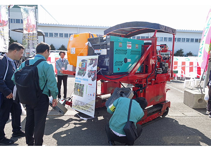 落合刃物工業(株)は、先般開催の静岡県落合会総会で製品紹介を行った。紙面では発表された4機種を紹介した。【複合管理機用温水除草アタッチメント】同機は、温水を草にかけて枯らして除草する機械。そのメカニズムは細胞内のタンパク質が温水で変性し草が枯れるメカニズム。温水除草の特徴として、高温水が草の根元に直接散布するので種子や活芽を抑制できる。【寒冷紗巻取・展開装置(年内開発製品化へ)】被覆資材の需要が増加して寒冷紗の使用が増えているが、その巻取り作業は重労働となる。そこで既に12種類と豊富なアタッチメントを用意している乗用型管理機OMR6に装着できるアタッチメントとして開発されたもの。前方で巻取り、後方の台で展開を行う。【自動運転(実証中)】人手不足の解消や熟練度に依存しない作業品質の均一化、危険作業の自動化などの安全性向上、茶園の状態の可視化などデータ活用、作業時間短縮など生産性向上に向けて開発されたもの。旋回文字道で行い、設定した畝間を正確に走行する。【BST-1200スライドトリマー】道路の除草作業の機械化し、人手不足や高温下作業、飛散防止、安全性向上のニースに対応すべく開発されたもの。小型特殊自動車で運転できるスキッドステアローダーを活用すべく開発されたもの。冬荷除雪作業で使用する機械の年間活用を目指す。
