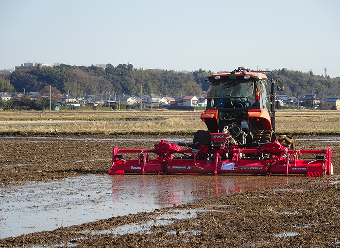茨城県龍ケ崎市の横田農場は(株)関東甲信クボタ稲敷営業所の協力の下、代かきハローの体感会を開催し、20人の農業経営者が参集した。今回使用したのは、ササキの超耕速マックスハローACE(エース)である。水…
