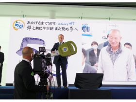 日本ニューホランド(株)は6日、全国25営業所をWEB会議システムで繋ぎ、創立50周年記念式典を苫小牧デポ内ビジターセンターで開催した。日本向け50台限定で特注された特別記念トラクタも紹介。色調はプロフォンドブルーでオ…
