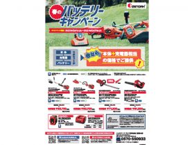 ハスクバーナ・ゼノア(株)はハスクバーナ、ゼノア両ブランドで対象商品1機種の①本体②充電器③バッテリーをセットで購入した場合、本体+充電器相当の価格で購入できる「春のバッテリーキャンペーン」を開催している。【キャンペー… -